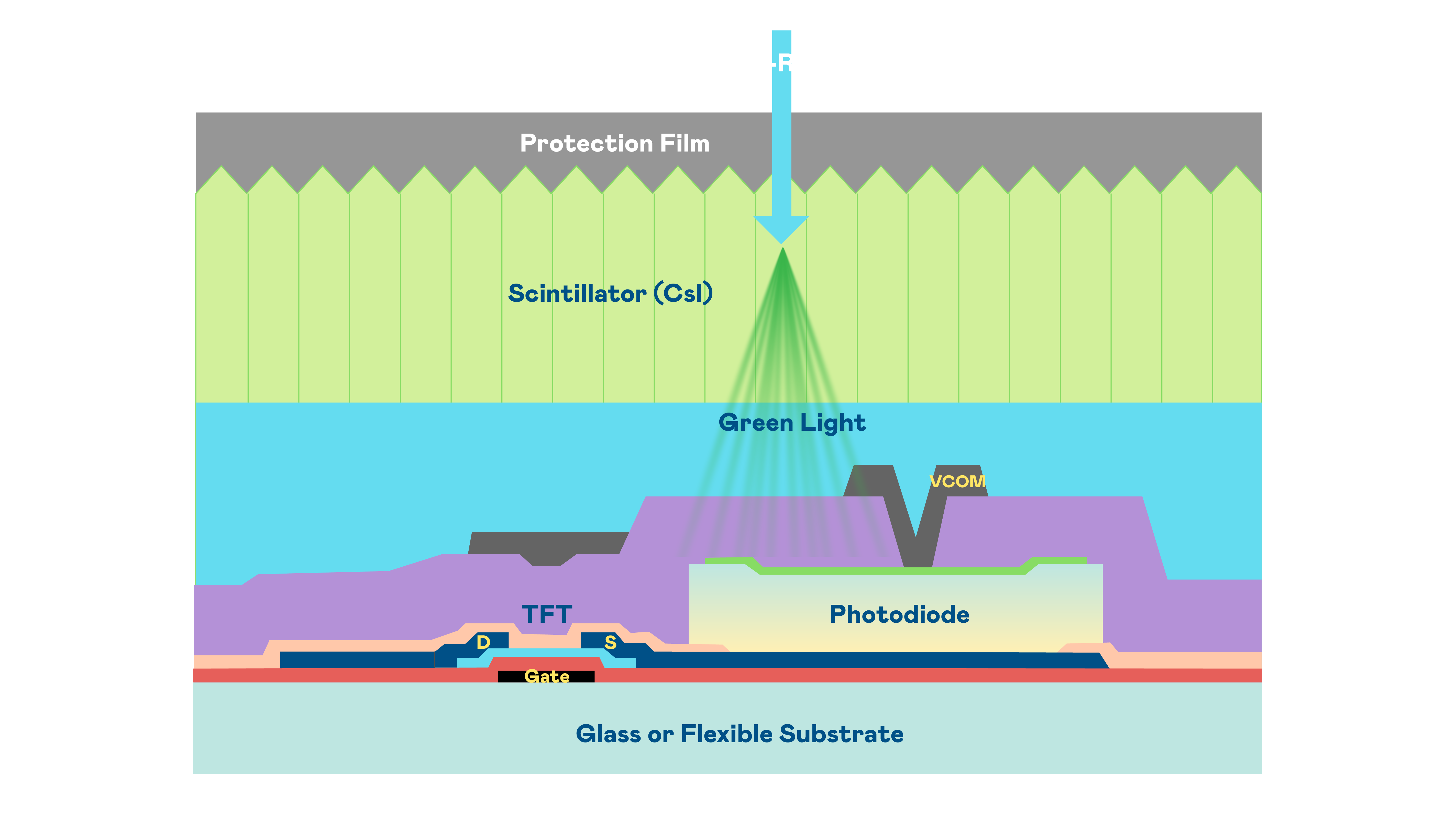 J9九游会的X光影像感测阵列使用薄膜电晶体 (TFT) 作为每个像素的读取开关,搭配光电二极体(Photodiode)的光电转换元件,用以感测X光影像讯号。